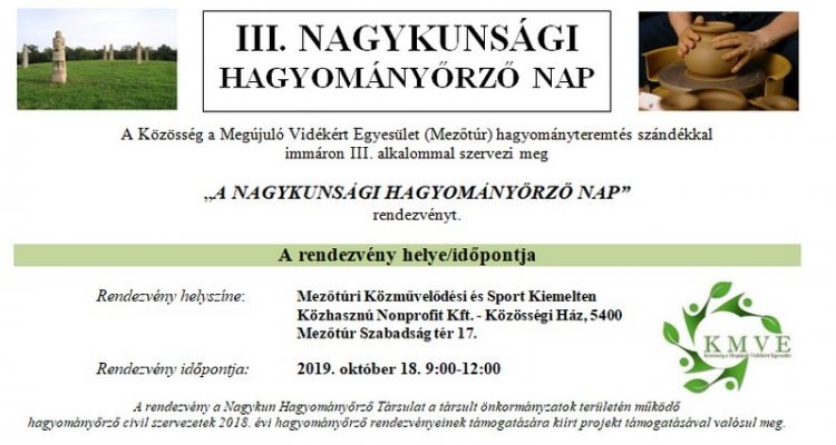 A Közösség a Megújuló Vidékért Egyesület (Mezőtúr) 2019. október 18-án hagyományteremtés szándékkal immáron III. alkalommal szervezi meg „A NAGYKUNSÁGI HAGYOMÁNYŐRZŐ NAP” rendezvényt.